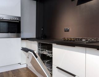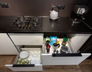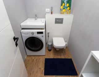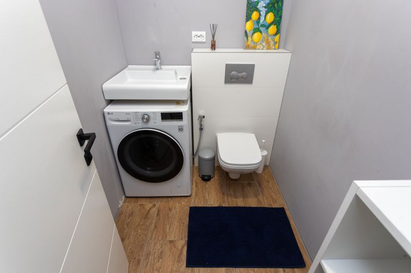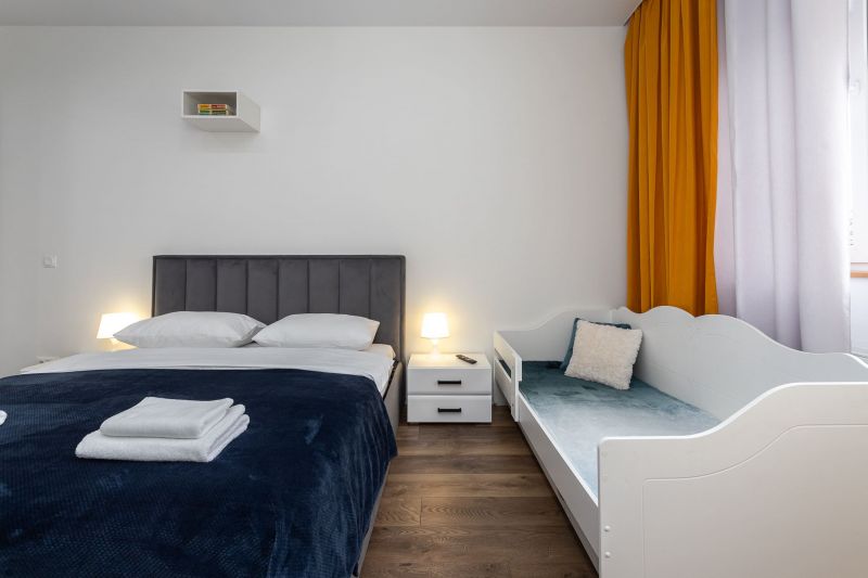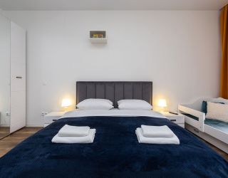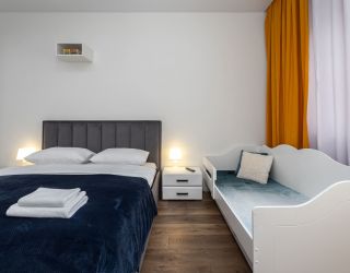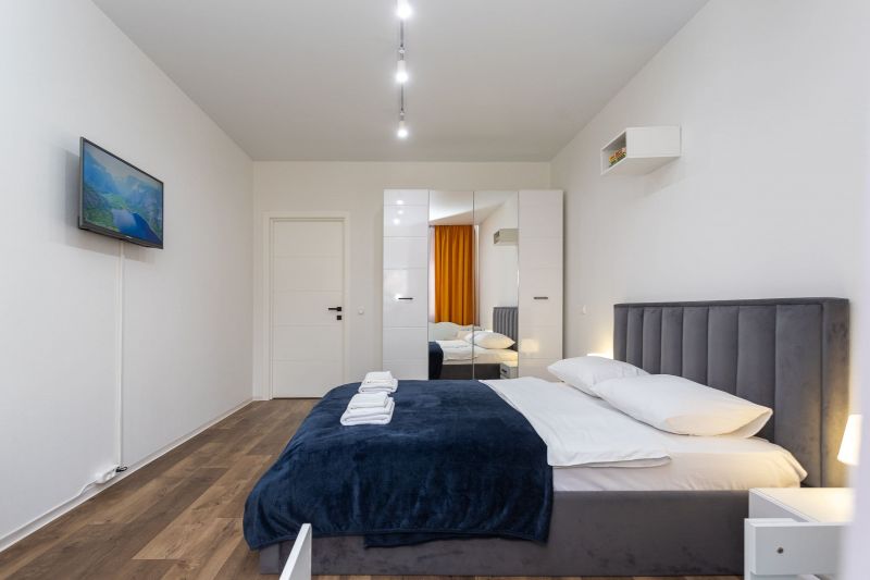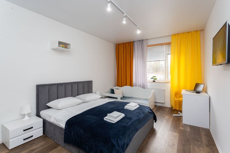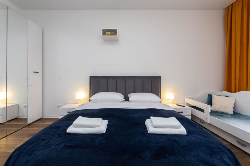 и техникой: есть просторная двуспальная кровать, утюг, фен, кондиционер, телевизор-ЖК, стиральная машина, плита, микроволновая печь, холодильник, а также кофемашина – по утрам гости могут варить ароматный кофе. Среди прочих услуг – безлимитный интернет, а на территории корпуса находятся охраняемая автопарковка и детская площадка.